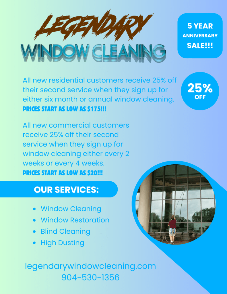 Current Sales & Discounts HomeCurrent Sales & DiscountsWhy Clean My Windows at Home? Celebrating 5 Years In Business SALE – 25% OFF!!! Mention this discount when requesting your free quote. Share this: Click to share on X (Opens in new window) X Click to share on Facebook (Opens in new window) Facebook Like Loading...